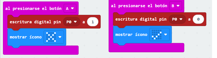 Código en Makecode, para encender la luz del Diodo Led con el botón A, y apagarlo con el botón B: