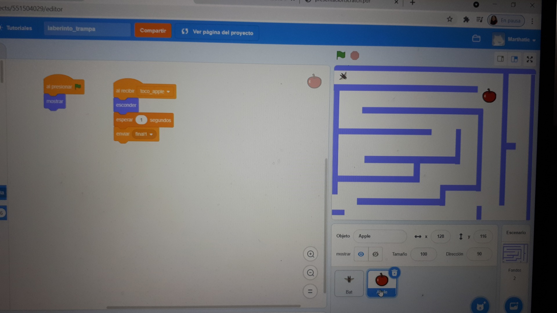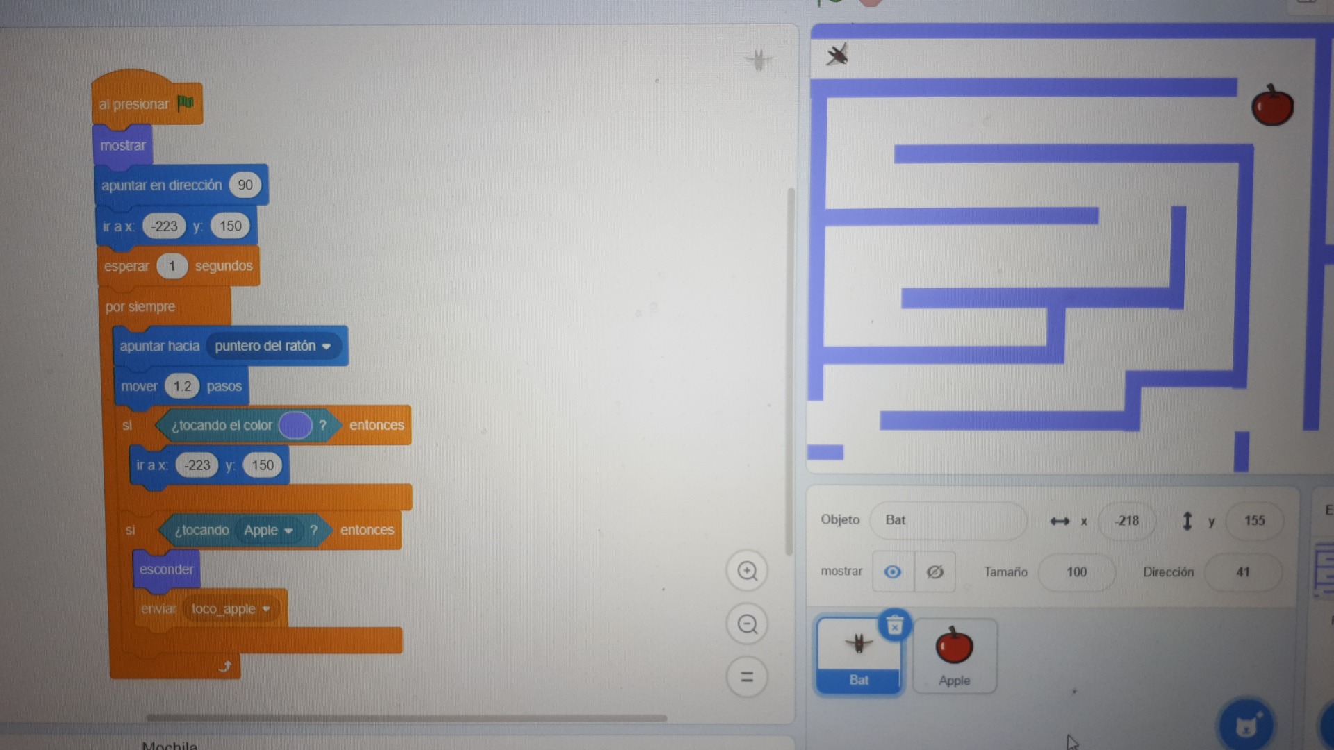 Click en la bandera verde para comenzar. Bat se ubica al inicio y sigue al puntero del mouse. Dirige al Bat indicándole el camino hacia el premio (apple) con el mouse.